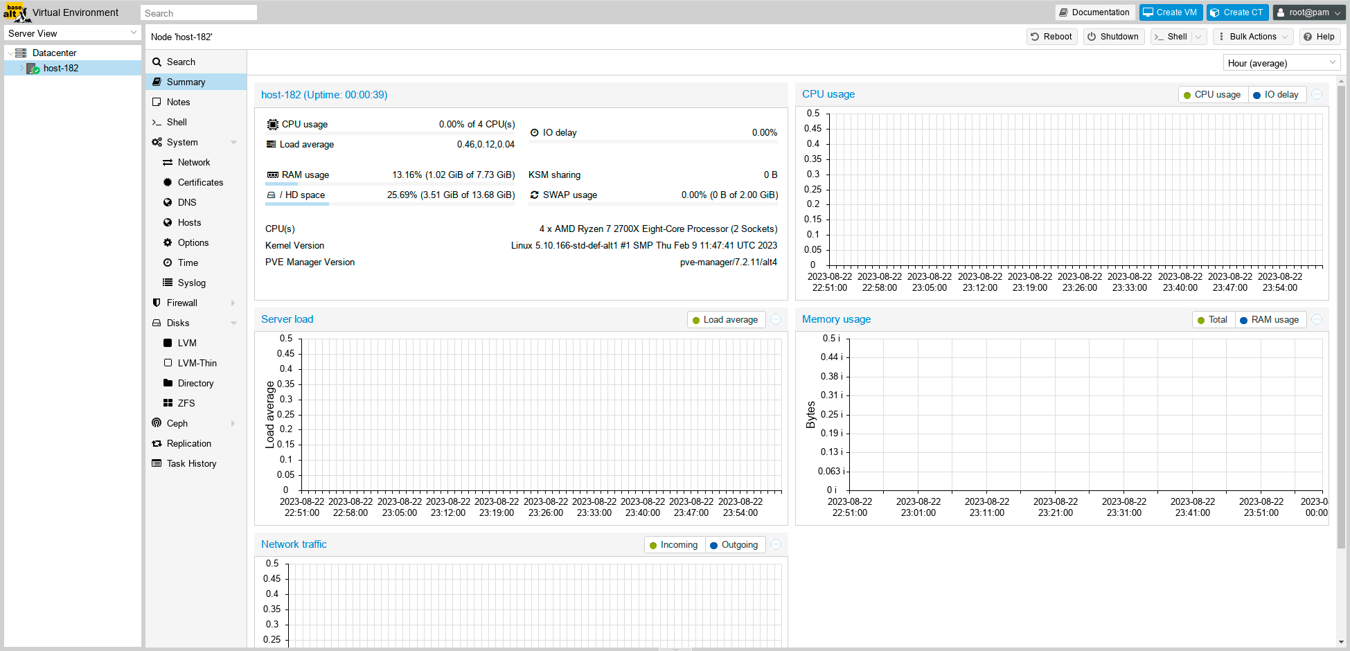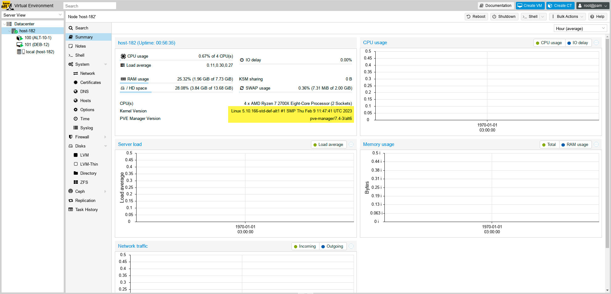 Также следует отметить, что PVE в Альт Сервер Виртуализации 10 использует собственное ядро Альт, на текущий момент это 5.10.166-std-def-alt и отличную от последней в оригинале версию PVE - 7.4.3/alt6.