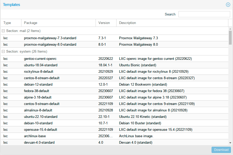 Для получения списка доступных для скачивания шаблонов контейнеров выполните команду:
