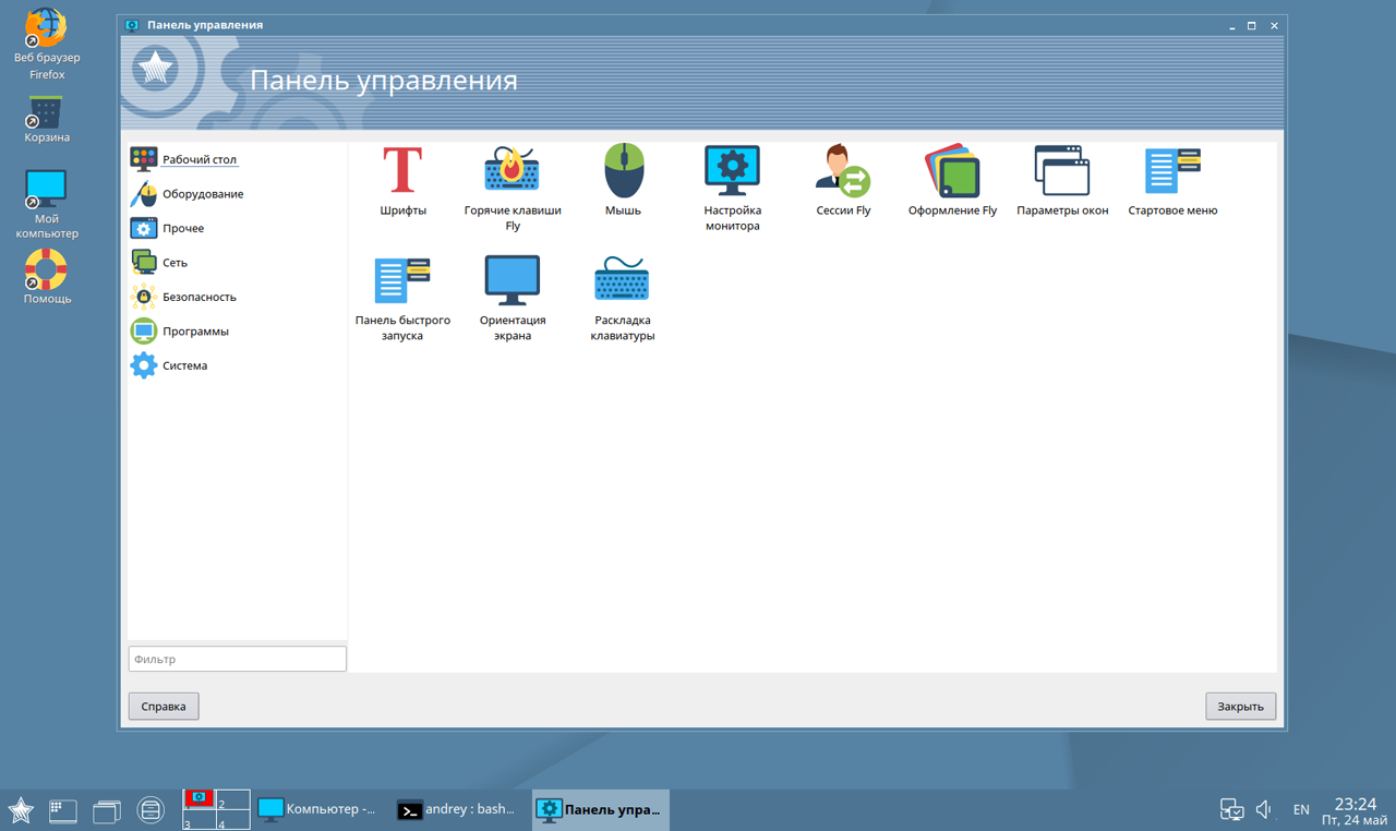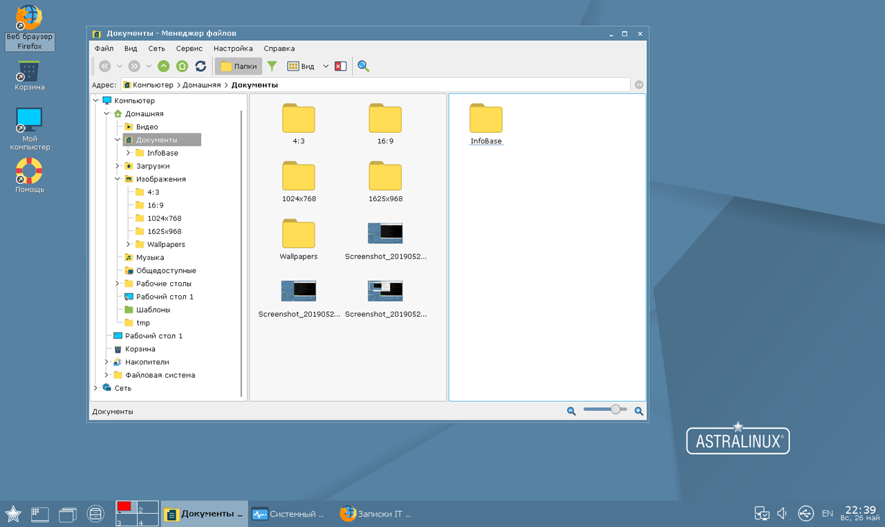 После входа в систему нас встречает рабочий стол. От былой аляповатости не осталось и следа, все строго и выверено. И если встречать по одежке, то здесь у Astra Linux все хорошо, а сам рабочий стол чем-то напоминает KDE и Windows одновременно, представляя собой классическое рабочее пространство, что не должно вызвать сложностей с его освоением.