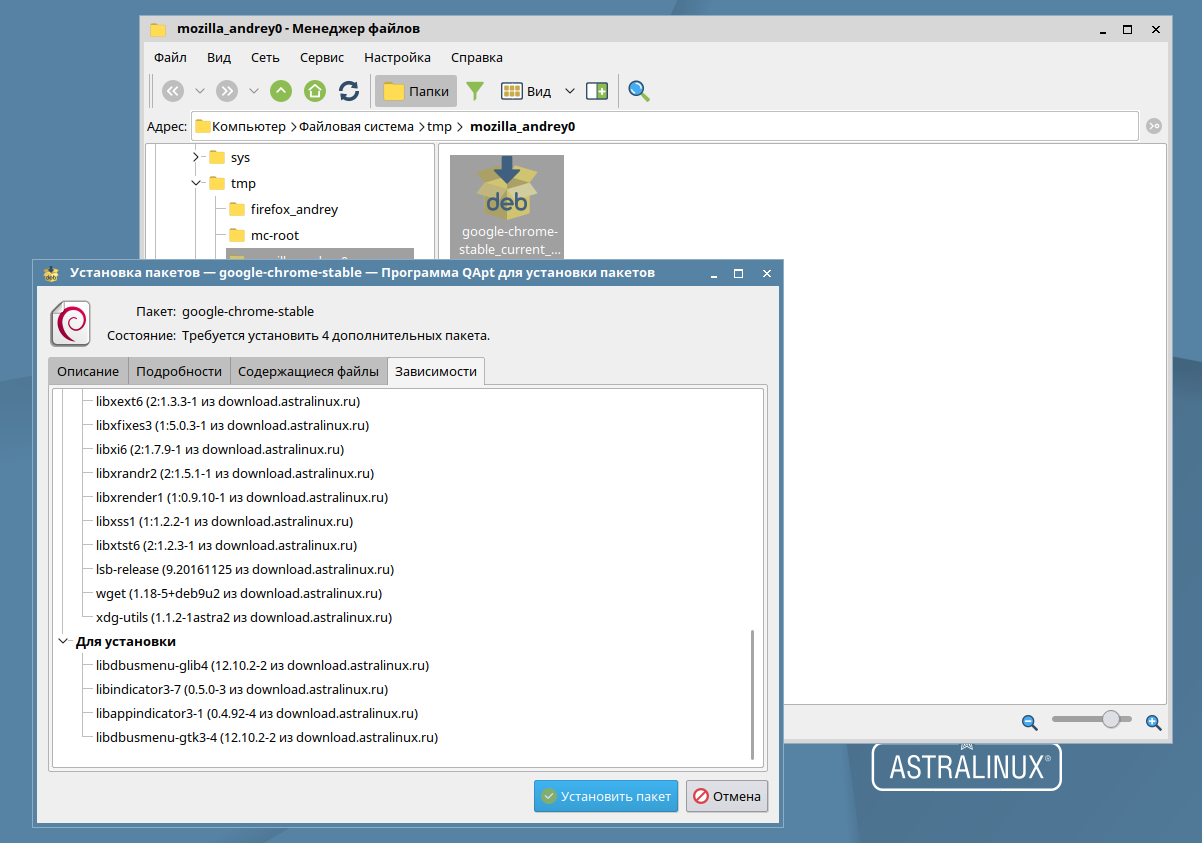 Так как у нас система общего назначения, то попробуем установить что-нибудь со стороны, для этого выпуска это вполне допустимо, в отличии от систем специального назначения. Попробуем скачать и установить Google Chrome. Никаких проблем у нас при этом не возникло, а все зависимости подтянулись из собственных репозиториев дистрибутива.