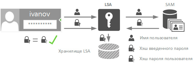 Затем LSA сравнивает хэш введенного пароля и хэш из базы SAM, в случае их совпадения аутентификация считается успешной, а хэш введенного пароля помещается в хранилище службы LSA и находится там до окончания сеанса пользователя.
