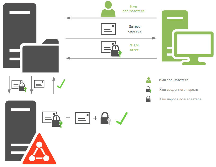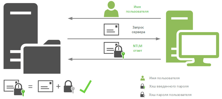 Зашифрованный хэшем пароля запрос сервера называется ответом NTLM и передается обратно серверу, сервер извлекает из хранилища SAM хэш пароля того пользователя, чье имя было ему передано и выполняет аналогичные действия с запросом сервера, после чего сравнивает полученный результат с ответом NTLM. Если результаты совпадают, значит пользователь клиента действительно тот, за кого себя выдает, и аутентификация считается успешной.