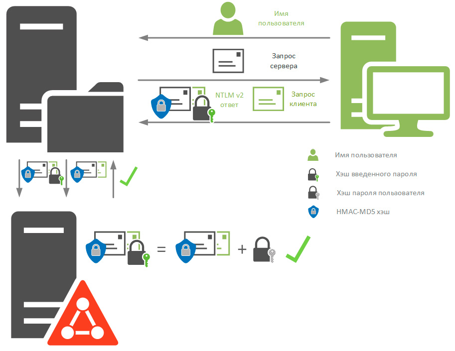 Сервер, получив NTLMv2-ответ и запрос клиента, объединяет последний с запросом сервера и также вычисляет HMAC-MD5 хэш, затем передает его вместе с ответом контроллеру домена. Тот извлекает из хранилища сохраненный хэш пароля пользователя и производит вычисления над HMAC-MD5 хешем запросов сервера и клиента, сравнивая получившийся результат с переданным ему NTLMv2-ответом. В случае совпадения серверу возвращается ответ об успешной аутентификации.