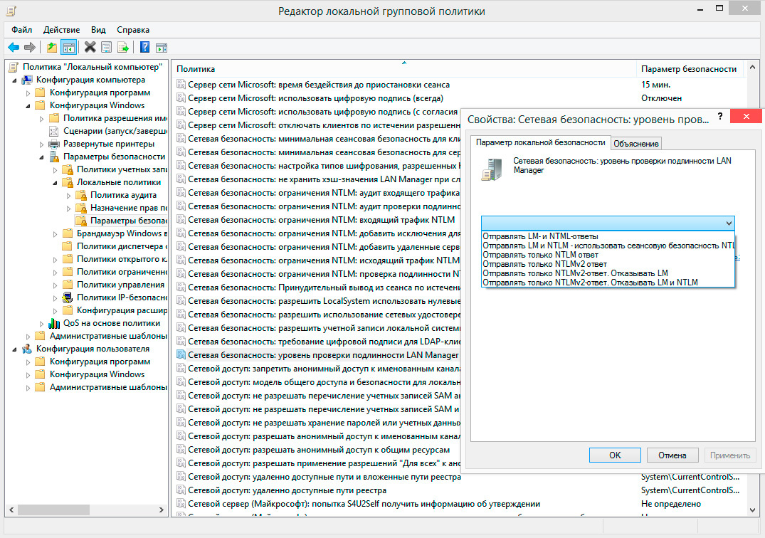 В нашей же политике мы видим широкий выбор значений, очевидно, что сегодня безопасными могут считаться политики начиная с Отправлять только NTLMv2-ответ и ниже по списку.