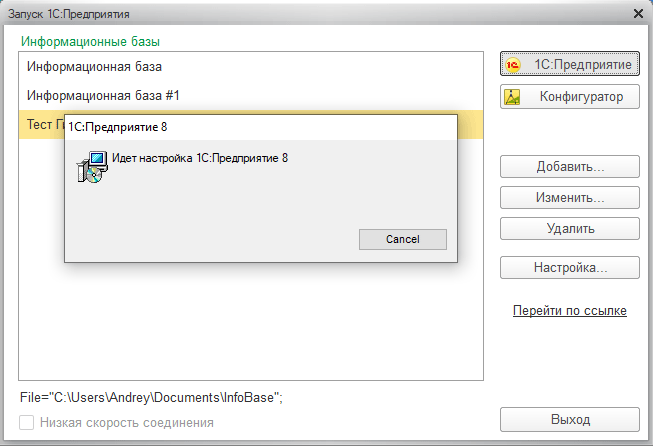 Общий ресурс готов, посмотрим, как это работает. Для первоначальной установки запустим файл 1cestart.exe с общего ресурса, это может сделать как администратор, так и сам пользователь. Это единственный раз, когда пользователю потребуется самостоятельно заходить на наш общий ресурс. Сразу после запуска начнется процесс установки платформы, который не задает вопросов и проходит полностью в автоматическом режиме.