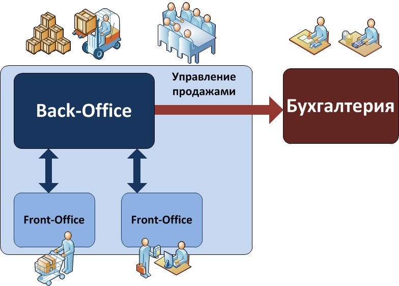 Такой подход позволяет максимально гибко подходить к автоматизации каждого участка, не заставляя выискивать компромиссы. При этом Front-office и Back-office могут быть как одним программным продуктом, так и различными.