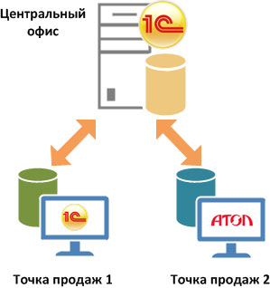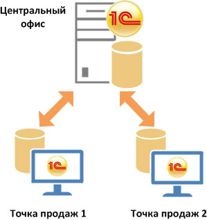 Если все торговые точки компании однородны, то можно использовать единую базу данных в режиме распределенной информационной базы (РИБ).