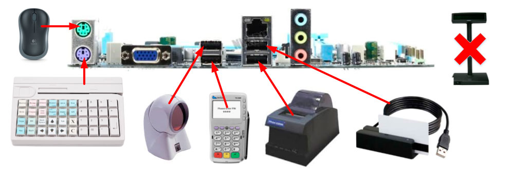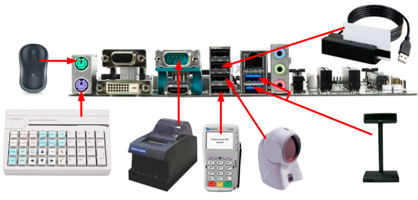 После этого становится понятно, почему мы каждый раз выше рекомендовали обращать внимание на разъемы подключения. Поэтому перед тем, как выбирать материнскую плату или готовые ПК для кассового узла выпишите список оборудования и используемые ими разъемы. После чего изучите возможности корпуса по возможности вывода внутренних портов наружу, и только затем выбирайте плату. Если для оборудования есть варианты COM или USB, то в отдельных случаях есть смысл взять устройство для COM-порта и сэкономить один USB-разъем. Например, в последнем случае мы использовали фискальный регистратор для COM-порта, так как фискальный регистратор или сканер штрих-кода могут использовать этот порт, в отличии, скажем, от ключа защиты.