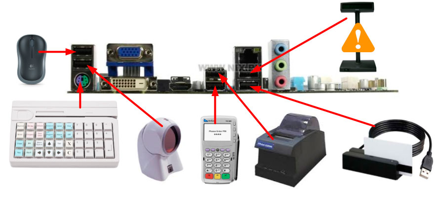 Нам уже не хватает разъемов. Сканер штрих-кода, пинпад и фискальный регистратор - оборудование обязательное, даже отключив считыватель магнитных карт, нам не хватит портов для дисплея покупателя, если он имеет питание от USB. Да, есть внутренние порты, но зачастую вывести их в компактном корпусе не представляется возможным или потребует поиска и приобретения низкопрофильных карт / контроллера. Но это мы рассмотрели минимальный вариант, а если нам понадобится установить что-либо еще, допустим весы или ключ защиты для платных драйверов, то мы снова столкнемся с проблемами.