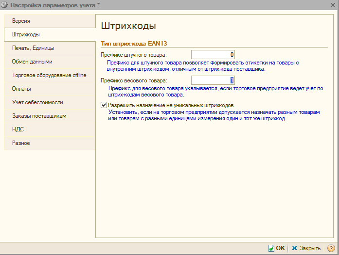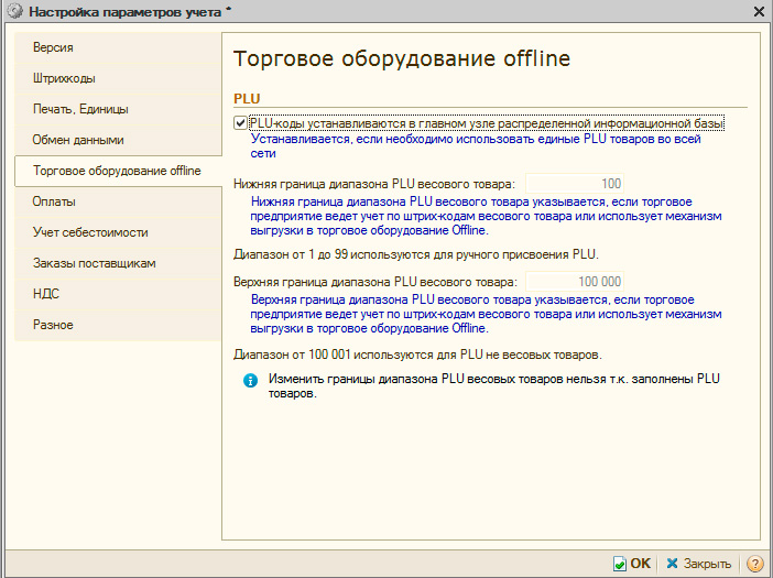По принятым в рознице правилам признаком собственного (внутреннего штрих-кода) является первая цифра 2, следовательно, столкнувшись с кодом, начинающимся на 21 товароучетное ПО понимает, что перед ним весовой товар и обрабатывает его по особым правилам. Прежде всего следует определить номенклатуру, для этой цели предназначен PLU-код, это 3-6 значное число произвольно присваиваемое весовым товарам. Диапазон PLU-кодов также указывается в настройках и изменить его можно только до того, как заведена первая весовая номенклатура.