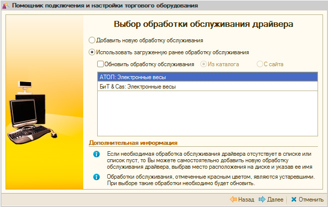 Помните, что обработка должна соответствовать драйверу, т.е. если вы купили драйвер от АТОЛ, то и обработку нужно выбирать соответствующую. Если нужной обработки нет, выберите пункт Добавить новую обработку обслуживания и укажите каталог с обработками. Стандартные обработки находятся в каталоге установки шаблона конфигурации: C:\Users\%UserName%\AppData\Roaming\1C\1Cv82\tmplts.