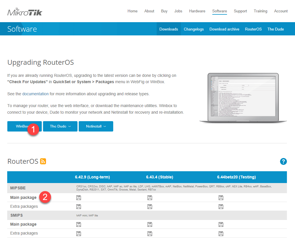 Для этого перейдем на сайт производителя в раздел Downloads и скачаем свежую версию Winbox - графической утилиты для настройки, а также свежую версию RouterOS. Представленные на странице пакеты отличаются только архитектурой вашего роутера, если вы ее не знаете, то рядом перечислены все подходящие модели роутеров. В каждом разделе представлено два пакета: Main и Extra, первый - это основная прошивка, то, что находится в вашем устройстве из коробки, второй - дополнительные пакеты, которые можно установить самостоятельно, они нам сейчас не нужны.
