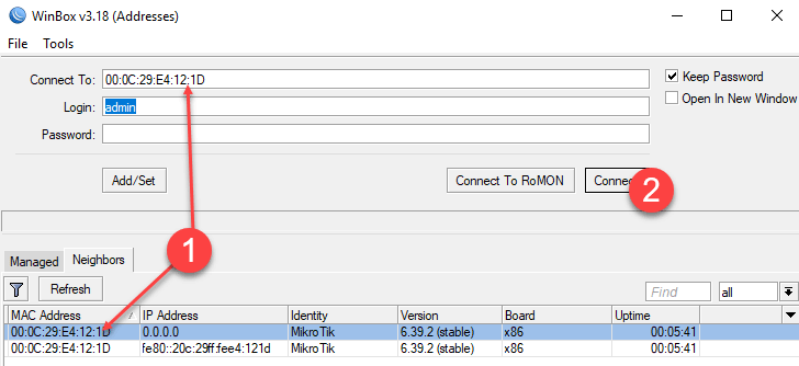 Теперь подключим патч-корд к любому порту роутера, кроме первого и запустим WinBox. По умолчанию в Mikrotik включен MAC-сервер, что позволяет подключаться к устройству по MAC-адресу, не меняя настройки сетевого адаптера. Ваше устройство через некоторое время появится на закладке Neighbors, после чего щелкните мышью на поле MAC-адреса, который автоматически подставится в строку подключения, для входа используйте admin с пустым паролем.