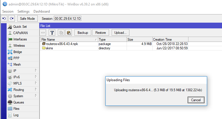 Для обновления перейдите в раздел Files и загрузите скачанный ранее пакет c RouterOS, это можно сделать как кнопкой Upload, так и простым перетаскиванием файла в окно. После чего просто перезагрузите устройство: System - Reboot.