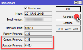 Следующим шагом обновим загрузчик RouterBOOT, для этого перейдем System - Routerboard и сравним текущую версию с доступной прошивкой, для обновления нажмите Upgrade и еще раз перезагрузите устройство.