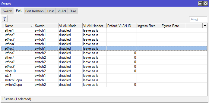 Для примера показан RB2011, который имеет два чипа коммутации: первый обслуживает порты ether1-ether5 и spf, второй ether6-ether10. Для портов, обслуживаемых одним чипом, доступна аппаратная коммутация, между портами обслуживаемыми разными чипами коммутация будет программной. Это следует учитывать при распределении портов, скажем если мы для файлового сервера выделим ether7, а для клиентов ether2-ether5, то получим повышенную нагрузку на устройство из-за программной коммутации.