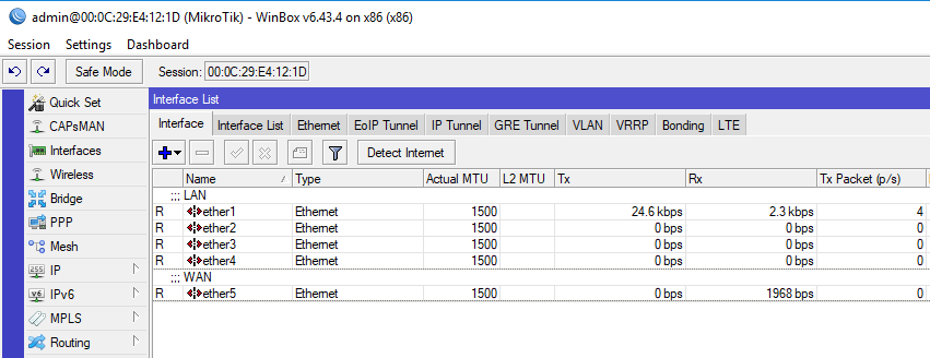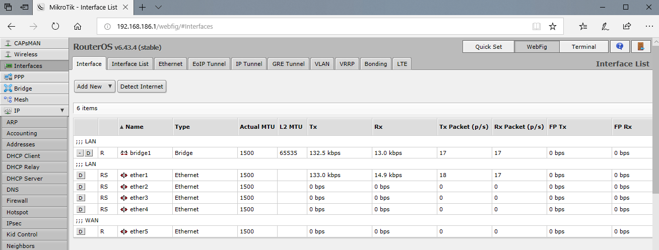 Далее в нашем примере мы будем использовать пятипортовый роутер и в качестве внешнего порта будем использовать здесь и далее последний порт. Остальные порты будут объединены в группу коммутации для локальной сети. Откроем Interfaces - Interface и добавим к портам ether1 и ether5 комментарии, указывающие на их назначение. Также можно переименовать сам порт, но мы предпочитаем оставлять им оригинальные названия, что позволяет быстро понимать к какому физическому порту относится та или иная запись.