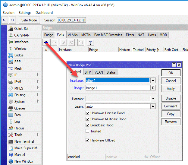 Затем переходим на закладку Bridge - Ports и последовательно добавляем в мост интерфейсы локальной сети ether1-ether4, обратите внимание на активную по умолчанию опцию Hardware Offload, которая включает аппаратную коммутацию, если она доступна.