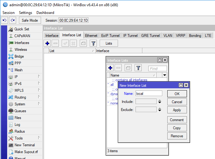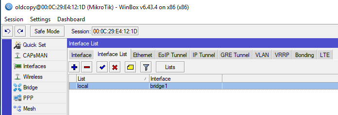 Итак, мост создан, порты добавлены, теперь перейдем в Interfaces - Interface List и создадим новый список, которому дадим название local: