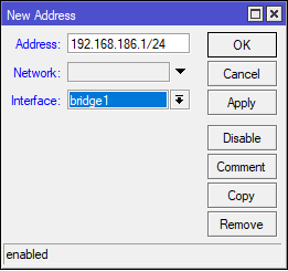 Осталось только присвоить нашему мосту локальный IP-адрес, для этого откроем IP - Addresses и добавим интерфейсу bridge1 нужный адрес. Обратите внимание, что используется формат записи IP/маска, т.е. вы должны указать 192.168.186.1/255.255.255.0 или более короткий вариант 192.168.186.1/24: