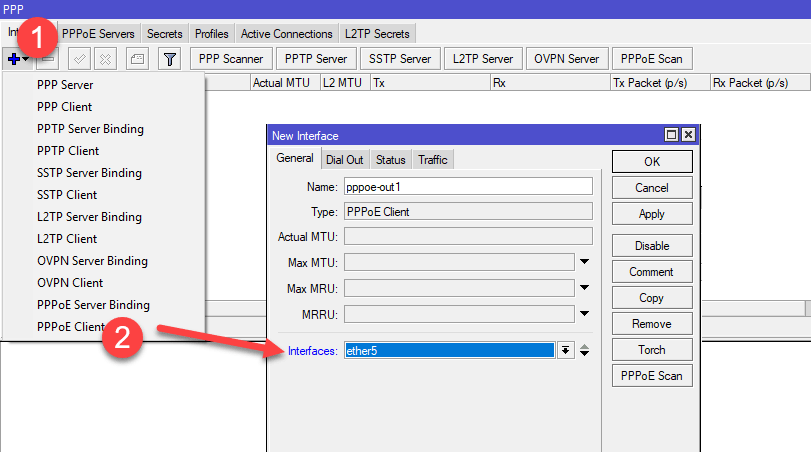 В зависимости от вашего провайдера способ подключения к интернет может быть разным. Чаще всего встречается прямое подключение, когда провайдер раздает настройки по DHCP или PPPoE подключение (используется федеральным провайдером Ростелеком). Мы будем рассматривать далее прямое подключение, однако если у вас коммутируемый доступ (PPPoE или VPN), то вам потребуется перейти в раздел PPP и создать коммутируемое подключение типа Client, ниже показан пример для PPPoE Ростелеком. В качестве используемого интерфейса укажите внешний интерфейс ether5: