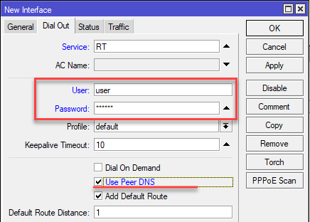 Затем на закладкеDial Out укажите данные для подключения к серверу провайдера и если вы хотите использовать его DNS-сервера установите флаг Use Peer DNS.