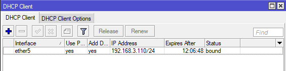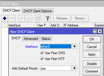 В зависимости от способа подключения вам может потребоваться настроить получение от провайдера внешнего IP-адреса, если у вас статический адрес, то переходим в IP - Addresses и добавляем еще один адрес, аналогично тому, как мы делали выше, но чаще всего провайдеры используют для присвоения адресов (даже статических) протокол DHCP. В этом случае переходим в IP - DHCP Client и добавляем нового клиента, в качестве интерфейса указываем внешний - ether5.