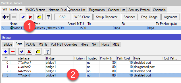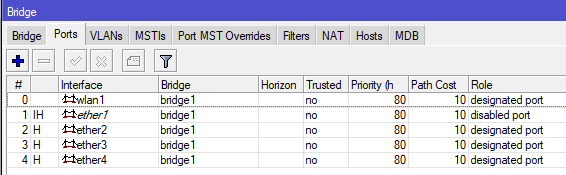 Теперь роутер будет пинговаться по указанному вами адресу и по нему можно будет подключиться к устройству. Для того, чтобы убедиться, что аппаратная коммутация работает перейдите в Bridge - Ports, символ H в строке порта указывает на то, что для обработки, передаваемой на уровне L2 информации, используется чип коммутации.