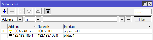 Для коммутируемых подключений DHCP-клиент настраивать не нужно, интерфейс получит адрес самостоятельно, чтобы убедиться в этом, еще раз откроем IP - Addresses, где должен появиться еще один адрес с индексом D (динамический) и принадлежащий коммутируемому подключению.