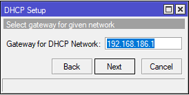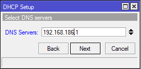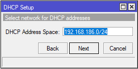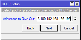 Потом будет предложено выделить диапазон адресов для выдачи клиентам, мастер предложить отдать весь доступный диапазон, но если дома еще можно так сделать, то в офисе однозначно нужно выделить статические диапазоны для серверов, сетевого оборудования, принтеров, камер и т.д. и т.п. Поэтому немного ограничим его аппетиты, мы выделили блок адресов 192.168.186.100-199, для дома или небольшого офиса этого вполне достаточно.