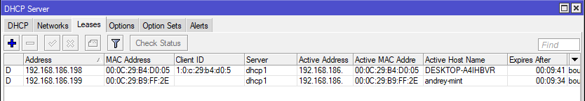 Завершаем работу мастера и переходим на закладку Leases, здесь, по мере подключения, будут появляться клиенты, которым ваш роутер начнет выдавать адреса. Обратите внимание на "фирменную" особенность Mikrotik - он начинает выдавать адреса начиная с конца диапазона, т.е. от 199 до 100.