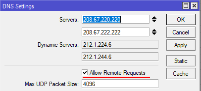 Следующим шагом настроим DNS-сервер, сделать это очень просто, открываем IP - DNS и добавляем в список вышестоящие DNS, это могут быть сервера провайдера или публичные службы, если вы получаете сетевые настройки от провайдера через DHCP, то его DNS-сервера уже будут указаны, они располагаются в разделе Dynamic Servers и не подлежат редактированию. Если вы добавите собственные сервера, то они будут иметь более высокий приоритет, в нашем случае указаны сервера OpenDNS.