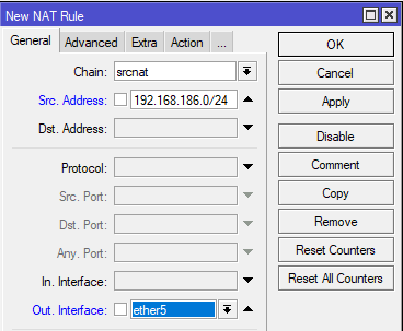 Базовые сетевые службы настроены, но доступа в интернет у клиентов пока нет, для этого осталось настроить службу трансляции адресов - NAT. Переходим в IP - Firewall - NAT и добавим новое правило, на закладке General в поле Src. Address укажем нашу локальную сеть 192.168.186.0/24, а в поле Out. Interface - внешний интерфейс, в нашем случаеether5. Если же вы используете коммутируемое подключение, то здесь следует указать его, например, pppoe-out1.