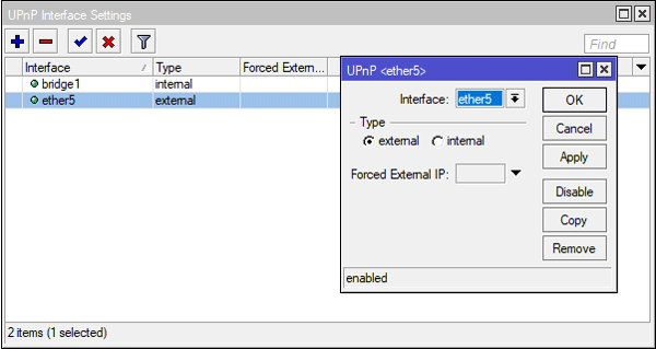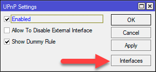 Если вы используете торренты или иной софт, требующий принимать входящие подключения, то следует также настроить службу UPnP, которая позволяет сетевому ПО автоматически осуществлять проброс нужных портов на роутере. Откроем IP - UPnP, включим службу и перейдем к настройке интерфейсов, нажав на кнопку Interfaces.