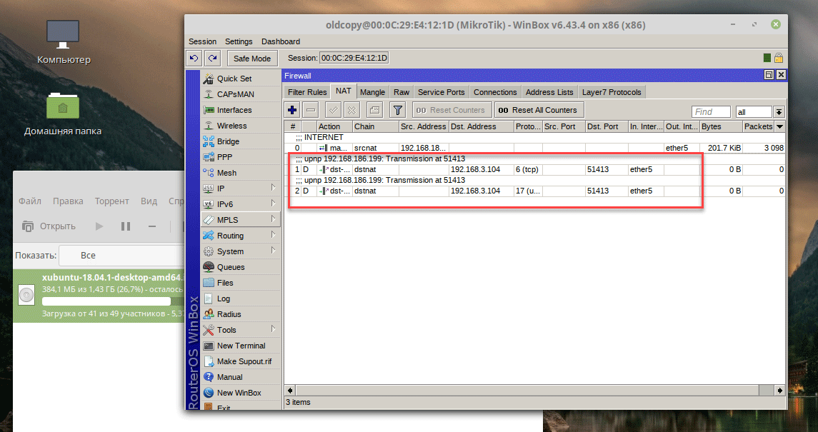 Теперь если мы запустим на клиенте торрент, то в IP - Firewall - NAT созданные автоматически правила для проброса портов, если же закрыть торрент-клиент, то данные правила исчезнут. Это удобно и безопасно, а также позволяет полноценно использовать современные сетевые приложения.