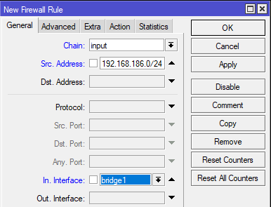 Итак, добавляем новое правило и указываем в нем Chain (цепочка) - input, Src. Address - 192.168.186.0/24 - диапазон вашей сети и In. Interface - bridge1, локальный интерфейс. Действия задаются на закладке Action, но так как accept (разрешить) уже установлено по умолчанию, то можно просто нажать OK.