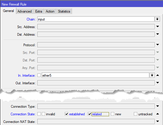 Следующим правилом разрешим входящие подключения на внешнем интерфейсе для уже установленных и связанных соединений, создаем новое правило: Chain - input, In. Interface - ether5, в Connection State устанавливаем флаг established и related, так как действие у нас снова accept, то просто сохраняем правило.