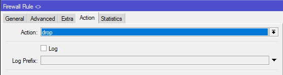 И самым последним создаем правило запрещающее все остальные подключения к роутеру:Chain - input, In. Interface - ether5, на закладке Action и ставим действие drop.
