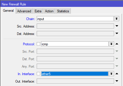Ниже располагаем разрешающие правила для различного типа входящего трафика. Обязательно разрешим роутеру принимать протокол ICMP: Chain - input, Protocol - icmp, In. Interface - ether5. ICMP - это не только пинги, но и гораздо более важные вещи, например, определение минимального MTU канала связи (PMTU).