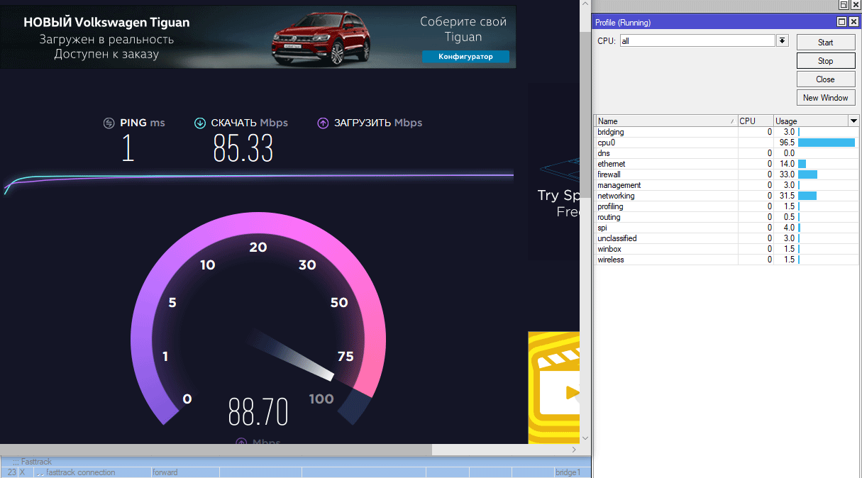Так нужен ли Fasttrack? Смотрите сами, мы взяли RB2011 и прокачали через него при помощи Speedtest поток в 90 Мбит/с (при тарифе в 100 Мбит/с) сначала с отключенным Fasttrack: