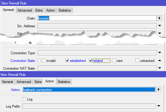 Поэтому первым делом добавим следующее правило: Chain - forward,Connection State: established, related, а на закладке Action установим действие fasttrack connection.