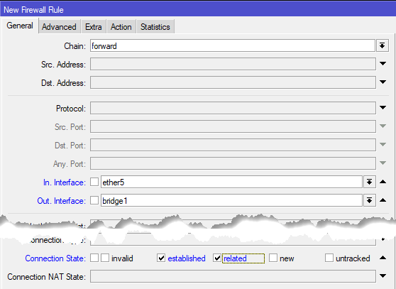 Остальной трафик из локальной сети в интернет мы никак не трогаем, потому что по умолчанию все и так разрешено, а любые дополнительные разрешающие правила окажутся пустышками, бесцельно расходующими вычислительные ресурсы роутера. Поэтому будем сразу закрываться от доступа из всемирной сети. Но прежде точно также разрешим уже установленные и связанные соединения: Chain - forward, In. Interface - ether5, Out. Interface - bridge1, ниже в Connection State устанавливаем флаги established и related, действие accept.