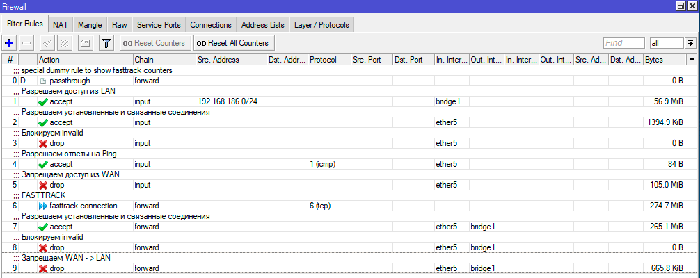 Таким образом мы пустим через Fasstrack все пакеты уже установленных транзитных соединений, и скажем честно, особой потребности как-то сложно обрабатывать такой трафик на роутере нет. Простую фильтрацию можно легко достичь предварительной обработкой и маркировкой пакетов, а на что-то более сложное у Mikrotik не хватит ресурсов, в этом случае есть смысл задуматься о полноценном роутере с прокси на базе Linux.