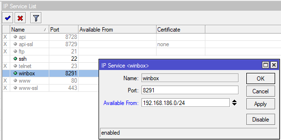 Обычно мы оставляем только Winbox и SSH, для Winbox не будет лишним задать диапазон допустимых адресов для подключения, ограничив их локальной сетью. При необходимости можно указать несколько сетей (сеть офиса и сеть филиала).