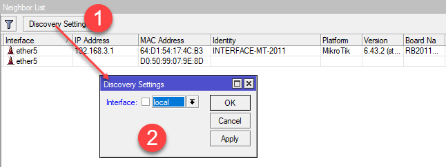Следующим шагом заходим в IP - Neighbors, данные настройки отвечают за автоматическое обнаружение устройств Мikrotik в сети, по вполне понятным причинам эту функцию следует ограничить только локальной сетью. Поэтому нажимаем Discovery Settings и в списке Interface выбираем созданный нами в самом начале список интерфейсов local.