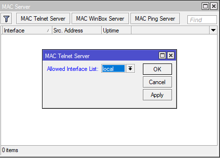Обнаружение устройства и возможность подключения к нему по MAC-адресу - несомненно удобно, но также только в локальной сети. Открываем Tools - MAC Server и устанавливаем в Allowed Interface List список интерфейсов local.