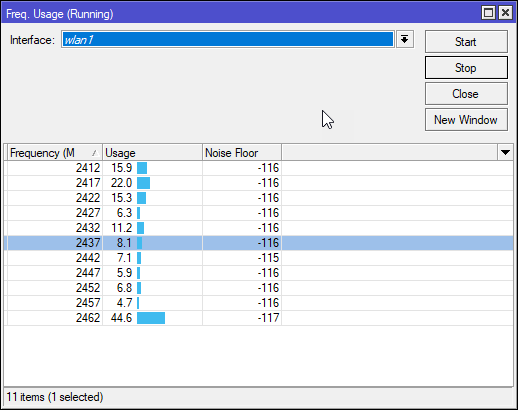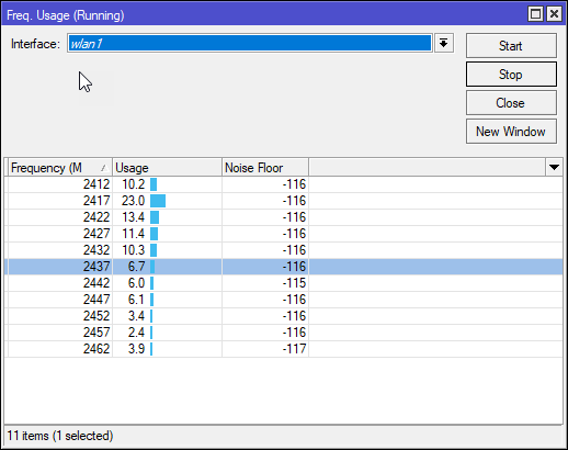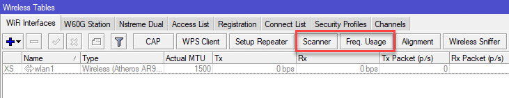 Если мы откроем раздел Wireless то увидим один или два беспроводных интерфейса (для моделей 2,4 + 5 ГГц), которые будут из коробки выключены. Но не будем спешить их включать, перед тем как настраивать Wi-Fi будет не лишним изучить обстановку в эфире. Для этого сначала нажмем кнопку Freq. Usage и оценим загрузку каналов.