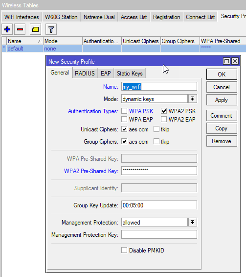 С каналом определились, теперь создадим профиль безопасности для нашей беспроводной сети в Wireless - Security Profiles. В нем оставляем только протокол WPA2 PSK и указываем ключ сети (пароль от Wi-Fi).