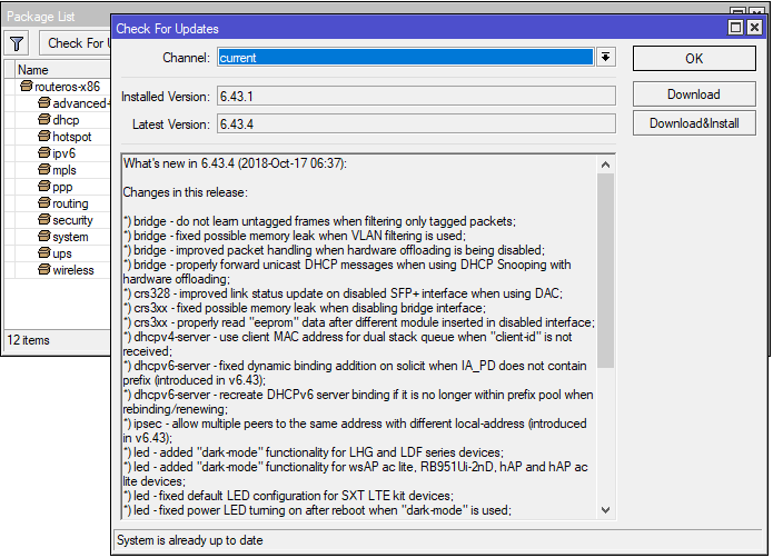 Также важно постоянно поддерживать в актуальном состоянии ПО роутера, теперь, когда ваше устройство имеет доступ в интернет, обновить RouterOS становится очень просто. Перейдите в System - Packages и нажмите Check For Updates, если доступна новая версия RouterOS, то вам будет предложено скачать и установить ее.