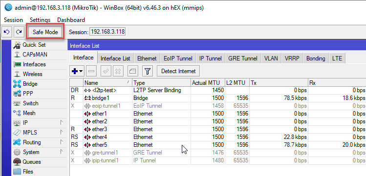 Чтобы включить безопасный режим следует нажать кнопку Safe Mode в Winbox: